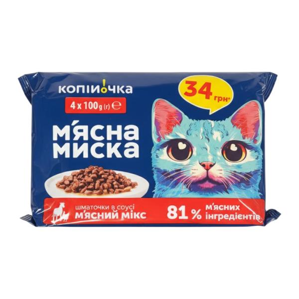 Корм д/котів М’ясна Миска шматочки в соусі м’ясний мікс 4*100г,пауч